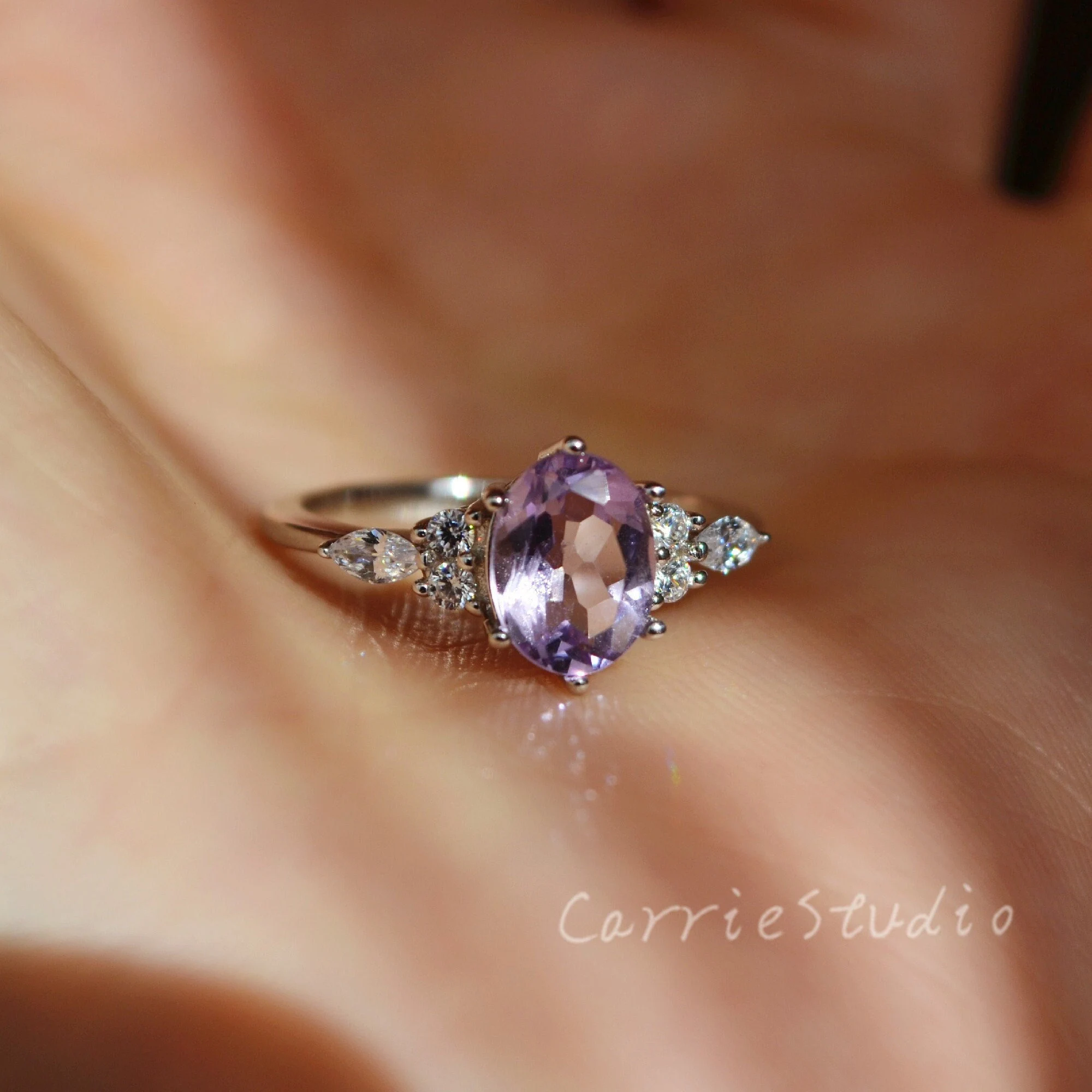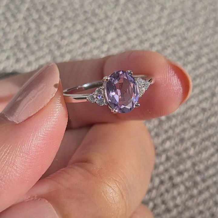 Elegant sterling silver ring with an oval amethyst center and clear side stones; handcrafted detail and polished finish.